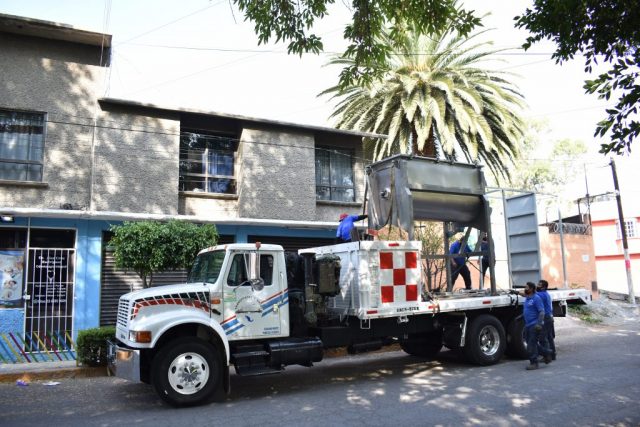 El recipiente entero gira, mezclando el contenido por movimiento rotacional.